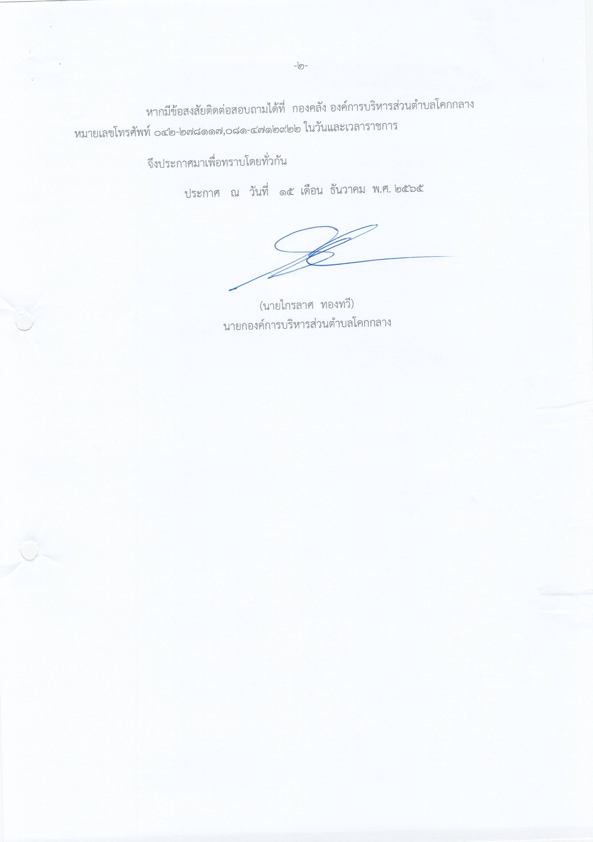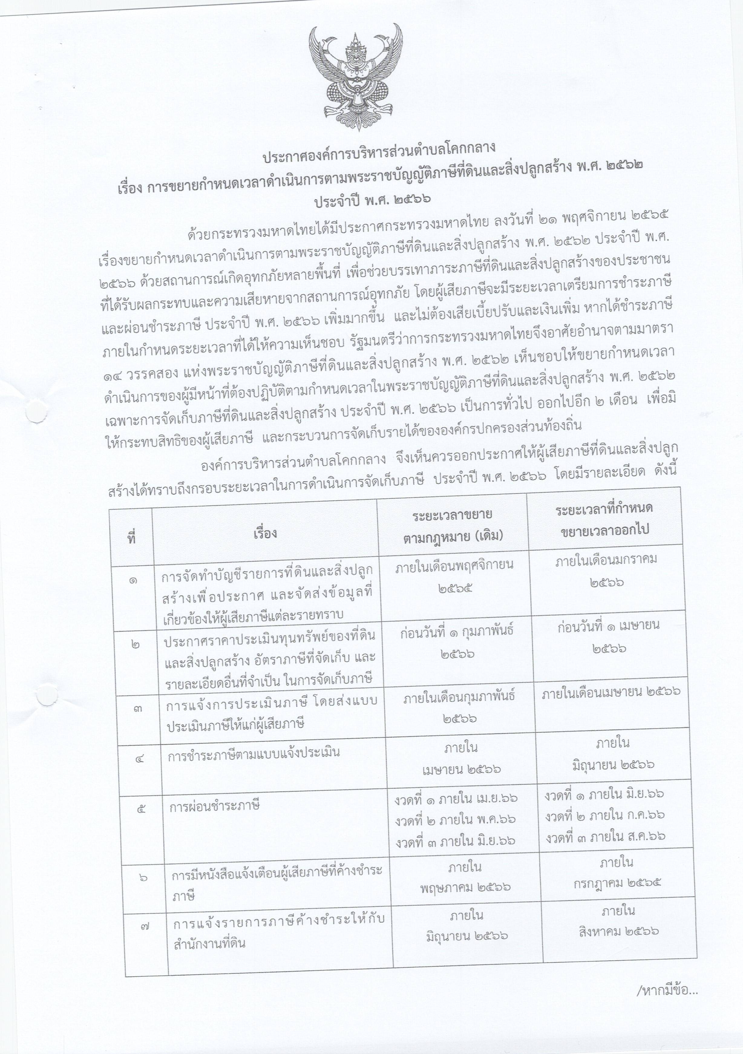 ประกาศองค์การบริหารส่วนตำบลโคกกลาง เรื่อง การขยายกำหนดเวลาดำเนินการตามพระราชบัญญัติภาษีที่ดินและสิ่งปลูกสร้าง พ.ศ. 2562 ประจำปี พ.ศ. 2566