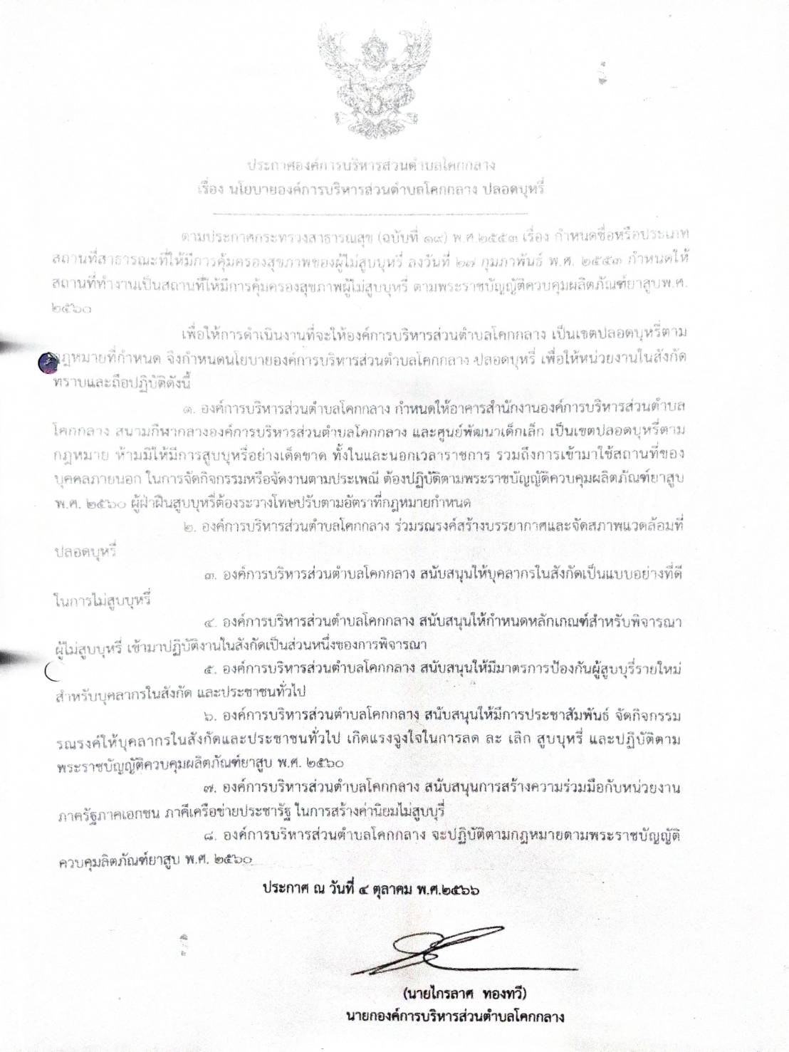 ประกาศองค์การบริหารส่วนตำบลโคกกลาง เรื่อง นโยบายองค์การบริหารส่วนตำบลโคกกลาง ปลอดบุหรี่